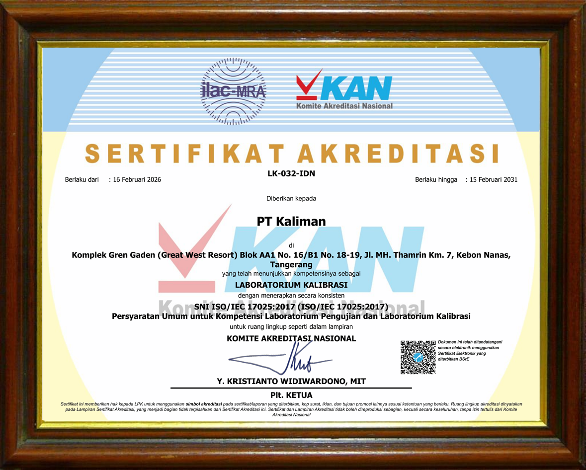 PT. KALIMAN adalah perusahaan swasta yang bergerak dalam bidang jasa kalibrasi, pengukuran, instrumentasi serta konsultasi. Berdiri sejak 6 Maret 2000, tercatat lebih dari 750 perusahaan industri dan beberapa rumah sakit besar yang telah menggunakan jasa di PT. KALIMAN dan 70% dari pelanggan kami merupakan pelanggan tetap sejak tahun 2005. Laboratorium kalibrasi PT. KALIMAN memiliki 140 lingkup yang telah diakreditasi oleh Komite Akreditasi Nasional (KAN) – Badan Standarisasi Nasional (BSN). Selain memberikan jasa kalibrasi, PT. Kaliman juga dapat memberikan pelatihan baik itu berupa inhouse maupun on the job training untuk keperluan industri dan kami siap untuk bermitra dengan semua jenis industri dan laboratorium.